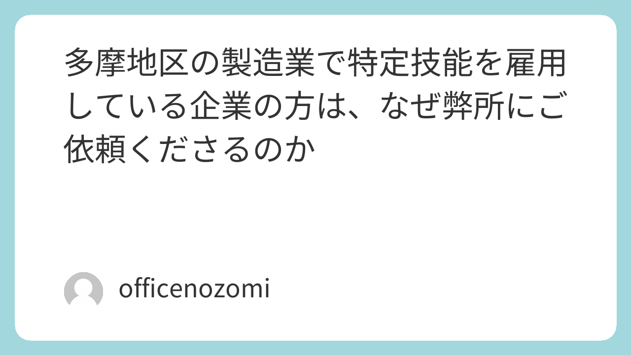 本記事では、多摩地区の製造業で特定技能を雇用している企業の方が、なぜ弊所にご依頼くださっているのか、お客様の声を中心に整理してお伝えします。